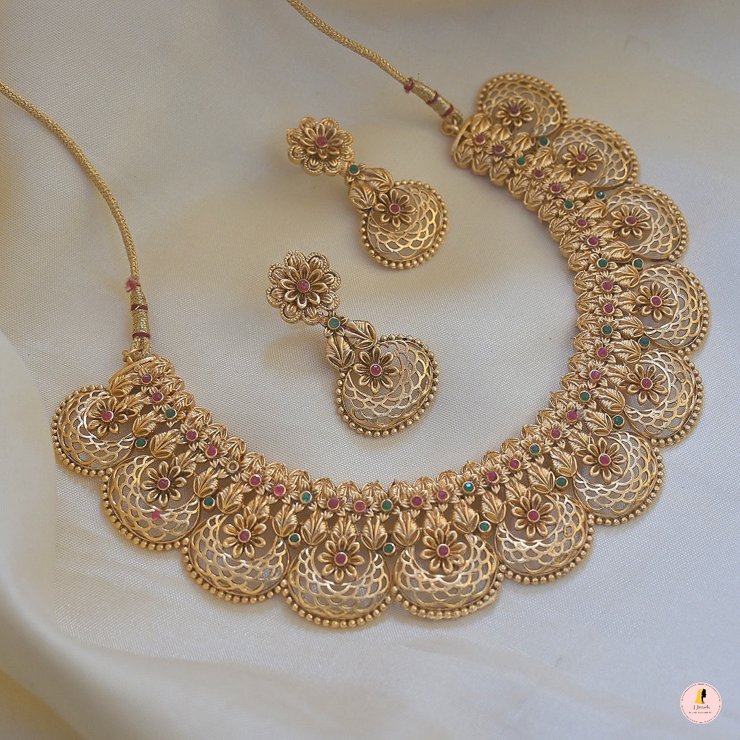 Enhance your ethnic charm with this exquisite gold-plated jewellery set designed for women who adore timeless elegance. This 2-piece set includes a beautifully crafted necklace, a pair of matching earrings,  all featuring intricate detailing and sparkling stones. Perfect for weddings, festivals, or special occasions, it effortlessly complements both traditional and contemporary outfits.